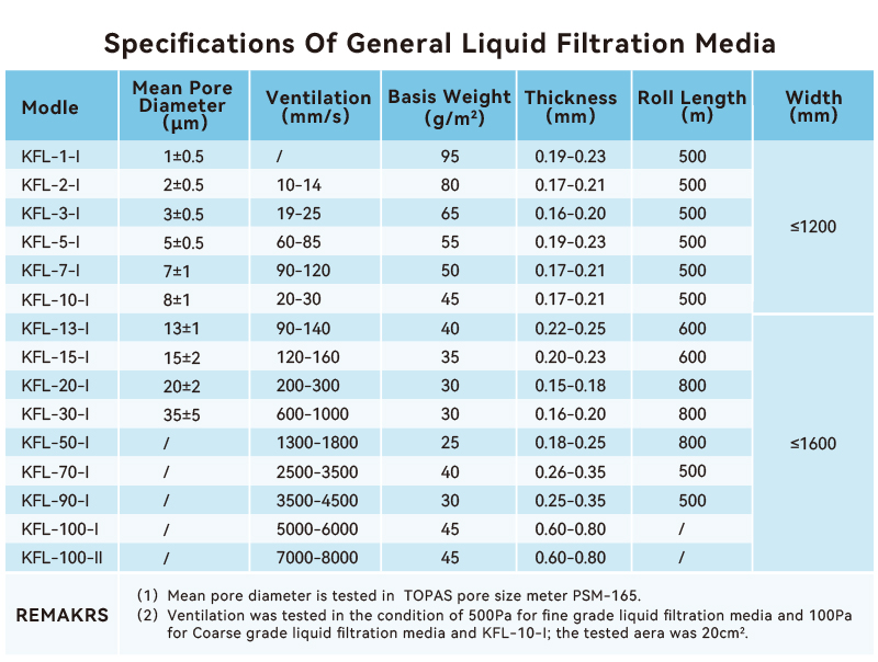 KINGFA's Meltblown Liquid Filtration Media comprises ultrafine polypropylene fibers that are thermally bonded and interlaced, resulting in a three-dimensional micro-porous structure with a randomly arranged spatial pattern.Through the implementation of multilayer composites, our fiber structure enables the production of filtration products with varying accuracies and dirt holding capacities. The coarse filter (large pore size series) ensures filtration accuracies ranging from 13-90μm, making it ideal for pleated filter cartridges measuring 10-40 inches. This particular liquid filter material finds extensive applications in industrial and chemical liquid filtration, as well as serving as a pre-filter in folded filter cartridges for RO systems.